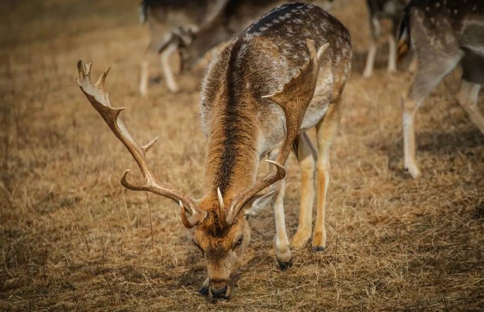 Männliche Damhirsche haben ein markantes Schaufelgeweih und sind im Sommer am weissgefleckten, rotbraunen Fell zu erkennen.